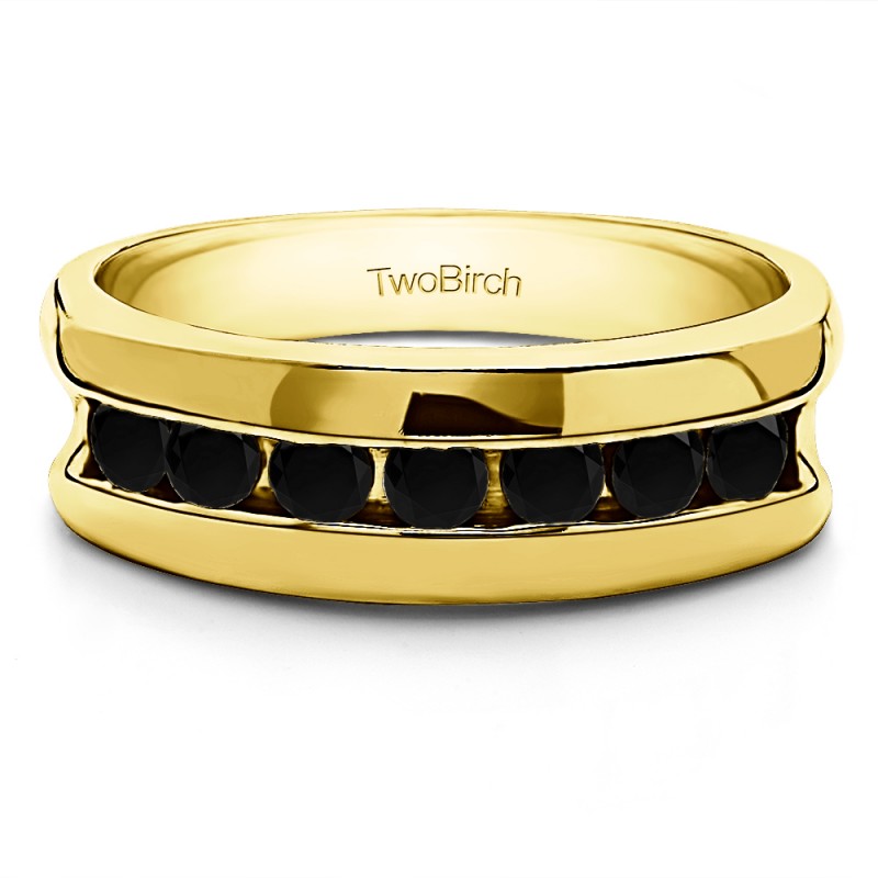 This men's ring features 7, black round channel set stones. The band measures 5.5mm in total width. The total combined carat weight is 0.98 carats. This listing features black cubic zirconia or black diamonds. This men's ring weighs 15.91 grams and features a comfort fit band. This men's ring features a stunning, high polish finish.
