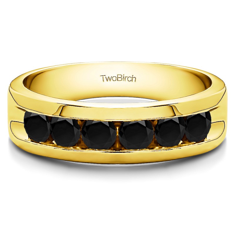 This men's ring features 6, black round channel set stones. The band measures 5.5mm in total width. The total combined carat weight is 0.99 carats. This listing features black cubic zirconia or black diamonds. This men's ring weighs 11.35 grams and features a comfort fit band. This men's ring has a wide channel, with open ends, and high polish finish.