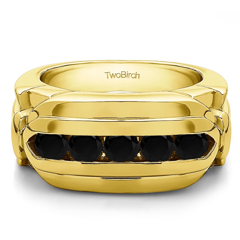 This men's ring features 5, black round channel set stones. The band measures 5.5mm in total width. The total combined carat weight is 1.25 carats. This listing features black cubic zirconia or black diamonds. This men's ring weighs 15.83 grams and features a comfort fit band. This men's ring is wide and has a raised channel in the center.