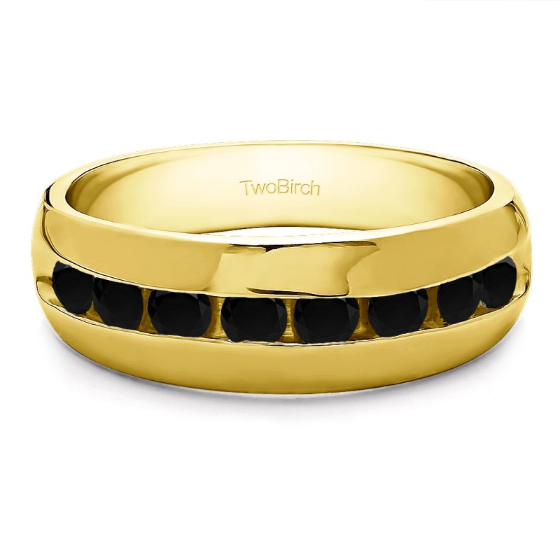 This men's ring features 8, black round channel set stones. The band measures 5.5mm in total width. The total combined carat weight is 1 carats. This listing features black cubic zirconia or black diamonds. This men's ring weighs 10.36 grams and features a comfort fit band. This men's wedding band features a stunning high polish finish, with open ended channels.