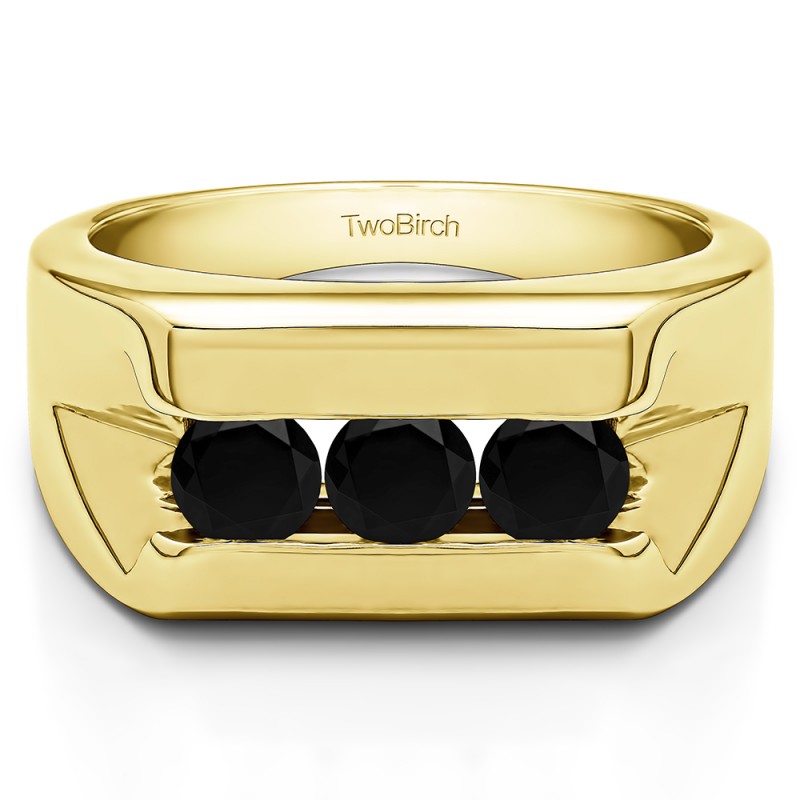 This men's ring features 3, black round channel set stones. The band measures 5.5mm in total width. The total combined carat weight is 1 carats. This listing features black cubic zirconia or black diamonds. This men's ring weighs 15.33 grams and features a comfort fit band. This ring has a flat top with open channels.