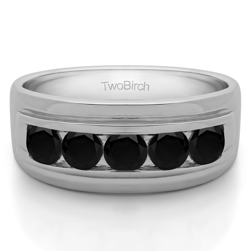 This men's ring features 5, black round channel set stones. The band measures 5.5mm in total width. The total combined carat weight is 2 carats. This listing features black cubic zirconia or black diamonds. This men's ring weighs 17.73 grams and features a comfort fit band. This men's ring is wide, with a raised channel in the center.
