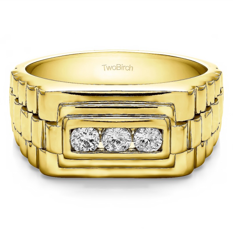 0.3 Ct. Three Stone Men's Wedding Ring with Ribbed Edges in Yellow Gold