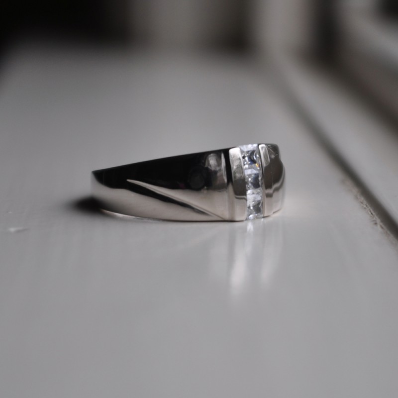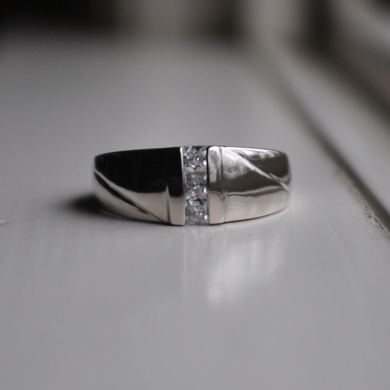 This men's ring features 3 white princess channel set stones. The band measures 5.5mm in total width. The total combined carat weight is 0.33 carats. This listing features moissanite, cubic zirconia or natural diamonds. This men's ring weighs 12.54 grams and features a comfort fit band. The channel of this ring is vertical with a raised channel.