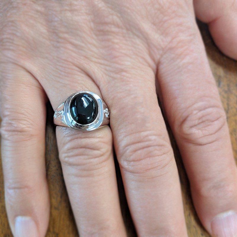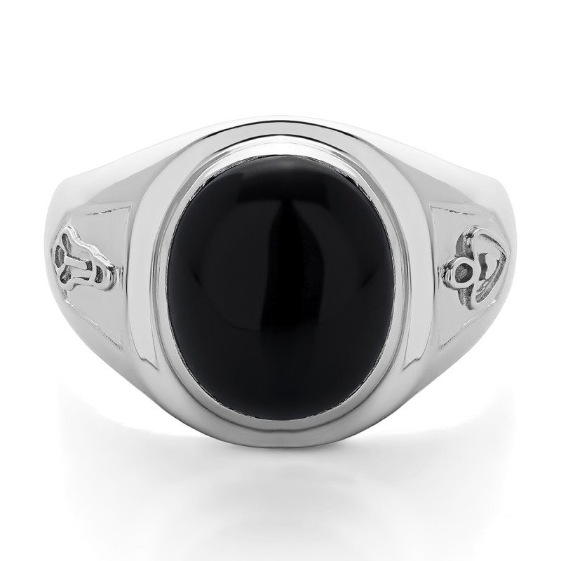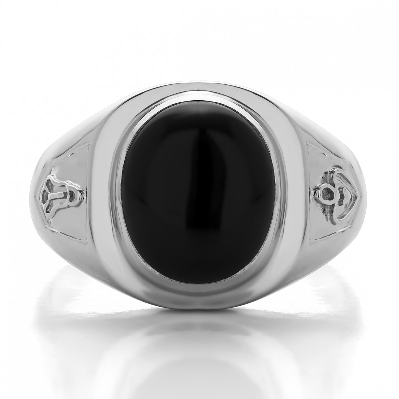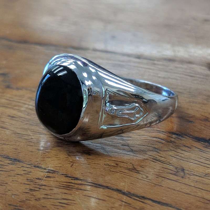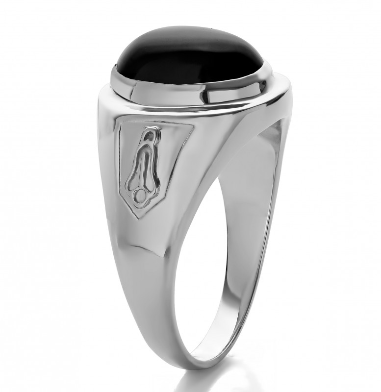 This men's ring features a cabochon onyx in the center, set with a stunning bezel. This ring also has Masonic detailing on each side., making it a fun alternative to the traditional Freemason's ring. This ring measures 14 millimeters wide. It is solid and built to last a lifetime of wear.