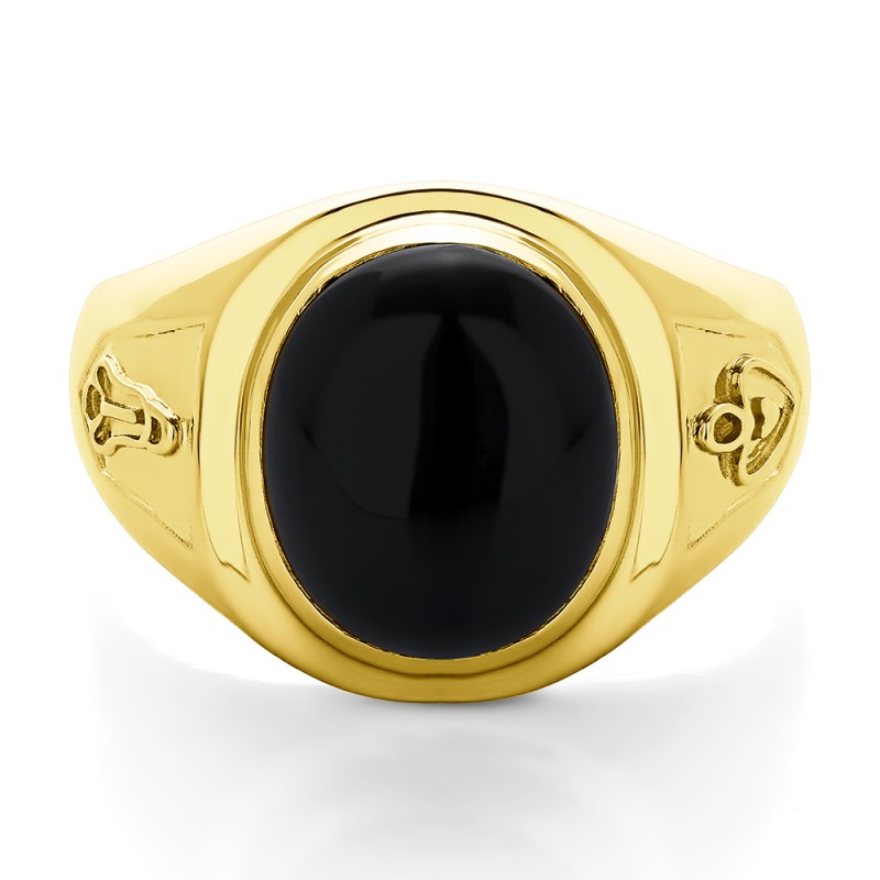 This men's ring features a cabochon onyx in the center, set with a stunning bezel. This ring also has Masonic detailing on each side., making it a fun alternative to the traditional Freemason's ring. This ring measures 14 millimeters wide. It is solid and built to last a lifetime of wear.