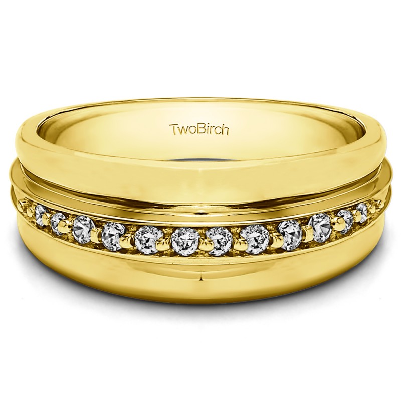 This men's ring features 12 white round prong in channel set stones. The band measures 5.5mm in total width. The total combined carat weight is 0.2 carats. This listing features moissanite, cubic zirconia or natural diamonds. This men's ring weighs 10.82 grams and features a comfort fit band. This ring features a raised channel, with the stones set with a shared prong in the channel.