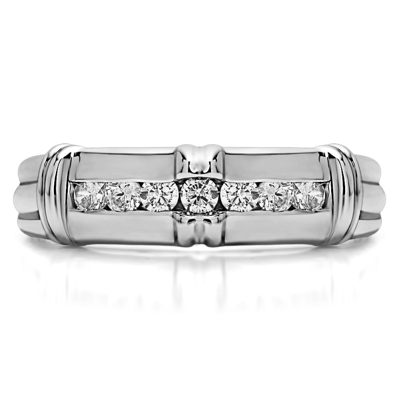 This men's ring features 7 white round channel set stones. The band measures 5.5mm in total width. The total combined carat weight is 0.31 carats. This listing features moissanite, cubic zirconia or natural diamonds. This men's ring weighs 9.92 grams and features a comfort fit band. This men's ring features a ribbed design on the middle and ends of the channel.