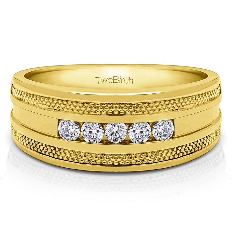 This men's ring features 5 white round channel set stones. The band measures 5.5mm in total width. The total combined carat weight is 0.5 carats. This listing features moissanite, cubic zirconia or natural diamonds. This men's ring weighs 17.46 grams and features a comfort fit band. This men's ring is wide, with millgraining on both sides of the shank, and a polished center.