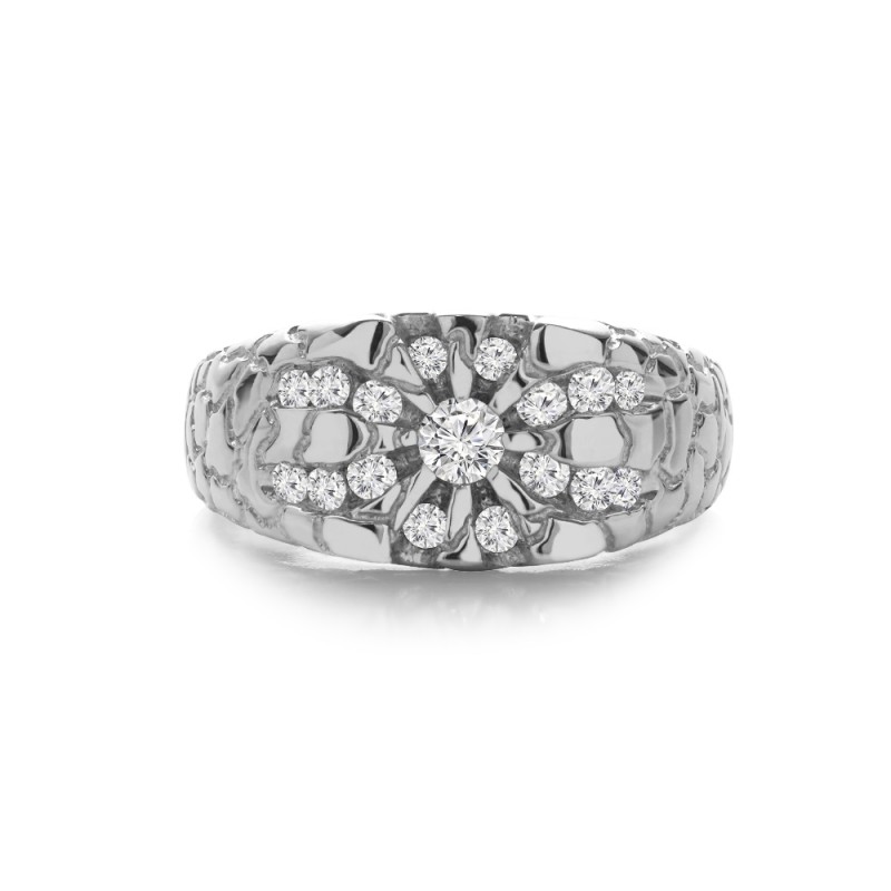 This men's ring features 17 white round channel set stones. The band measures 7 in total width. The total combined carat weight is 0.71 carats. This listing features moissanite, cubic zirconia or natural diamonds. This men's ring weighs 11.01 grams and features a comfort fit band. This men's ring features an engraved design with a high polish finish. It also has a cut out gallery making it lighter but still sturdy.