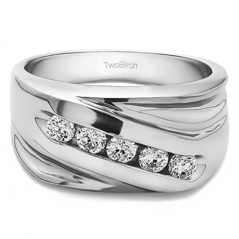 This men's ring features 5 white round channel set stones. The band measures 5.5mm in total width. The total combined carat weight is 0.5 carats. This listing features moissanite, cubic zirconia or natural diamonds. This men's ring weighs 18.28 grams and features a comfort fit band. This men's wedding ring has a straight channel, with a ribbed shank design and a high polish finish.