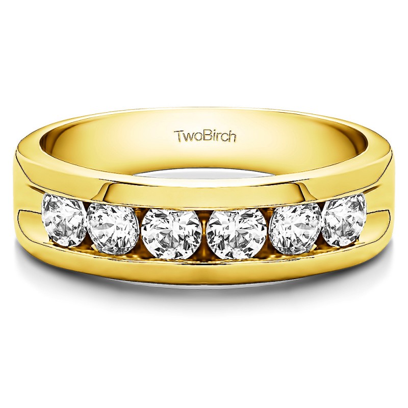 This men's ring features 6 white round channel set stones. The band measures 5.5mm in total width. The total combined carat weight is 0.99 carats. This listing features moissanite, cubic zirconia or natural diamonds. This men's ring weighs 11.35 grams and features a comfort fit band. This men's ring has a wide channel, with open ends, and high polish finish.