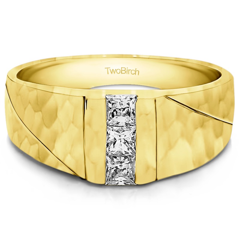 This men's ring features 3 white princess channel set stones. The band measures 5.5mm in total width. The total combined carat weight is 0.33 carats. This listing features moissanite, cubic zirconia or natural diamonds. This men's ring weighs 12.17 grams and features a comfort fit band. This men's ring has a vertical channel set row of princess cut stones and a hammered finish.