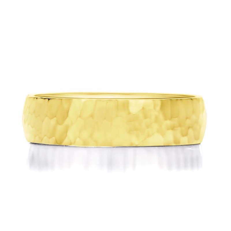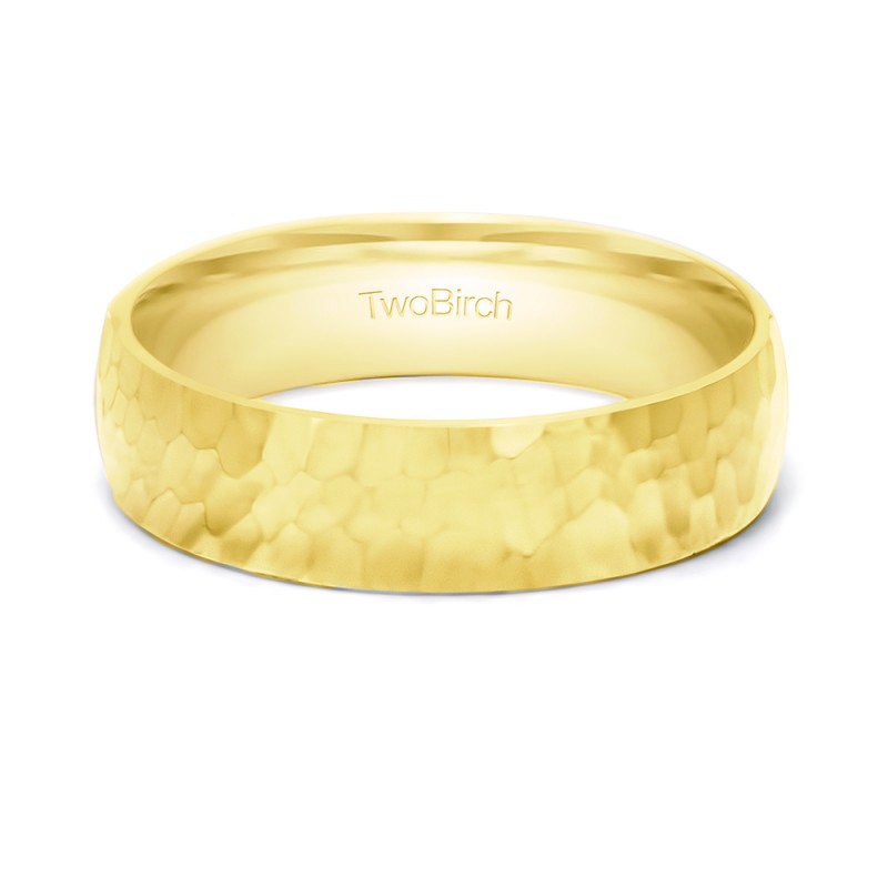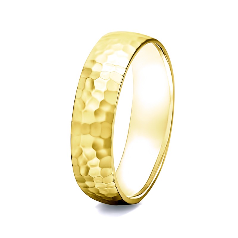 This men's ring features a hammered finish with a 5.5 millimeter width. This ring is solid, not hollow, making it sturdy and perfect to last a lifetime of daily wear.
