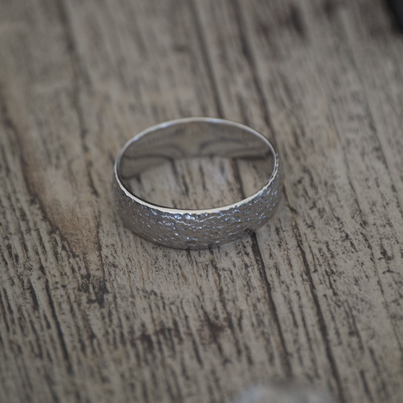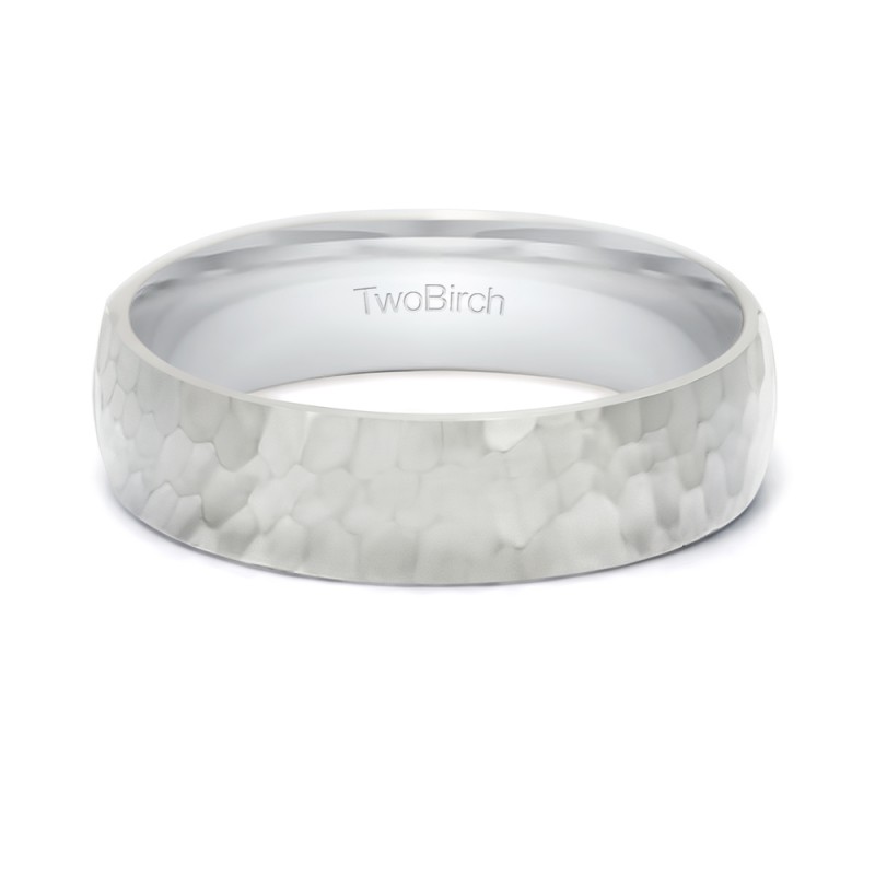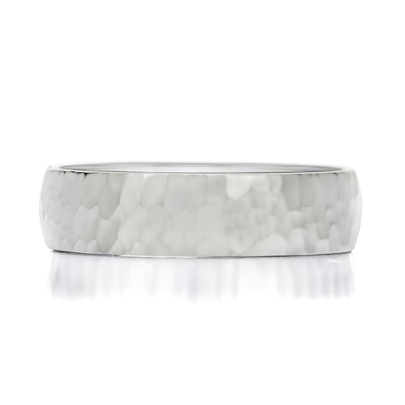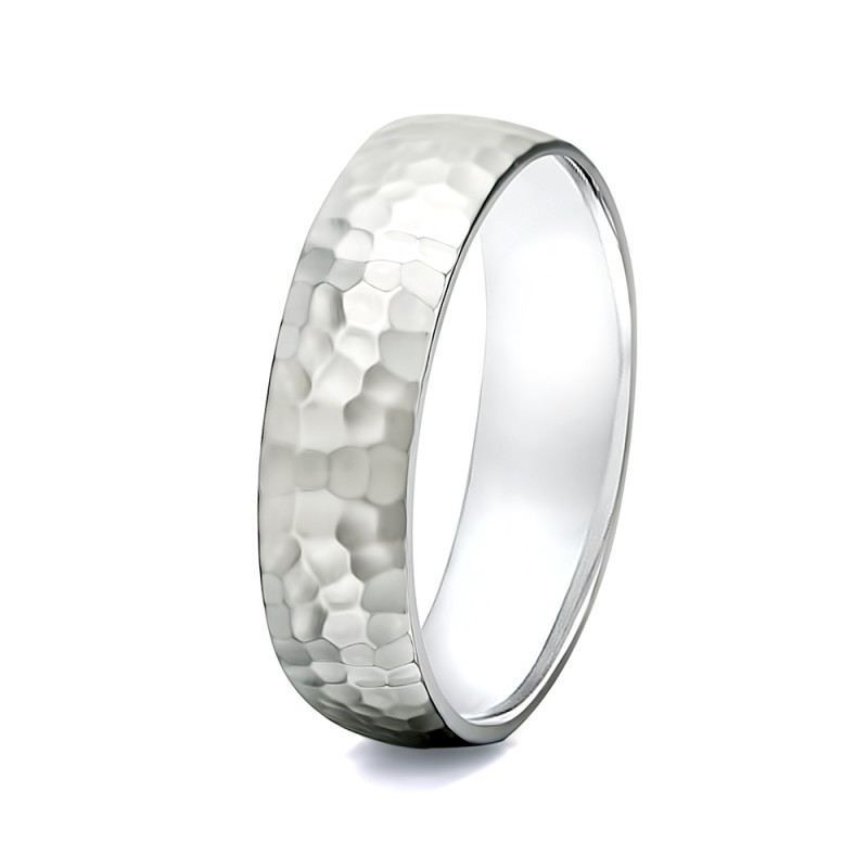 This men's ring features a hammered finish with a 5.5 millimeter width. This ring is solid, not hollow, making it sturdy and perfect to last a lifetime of daily wear.