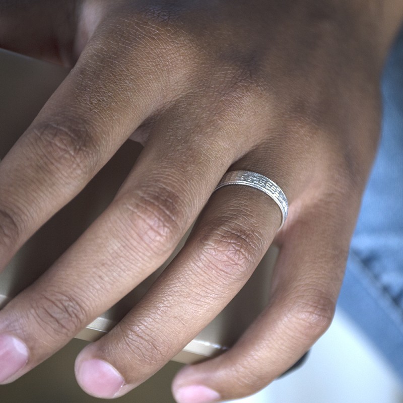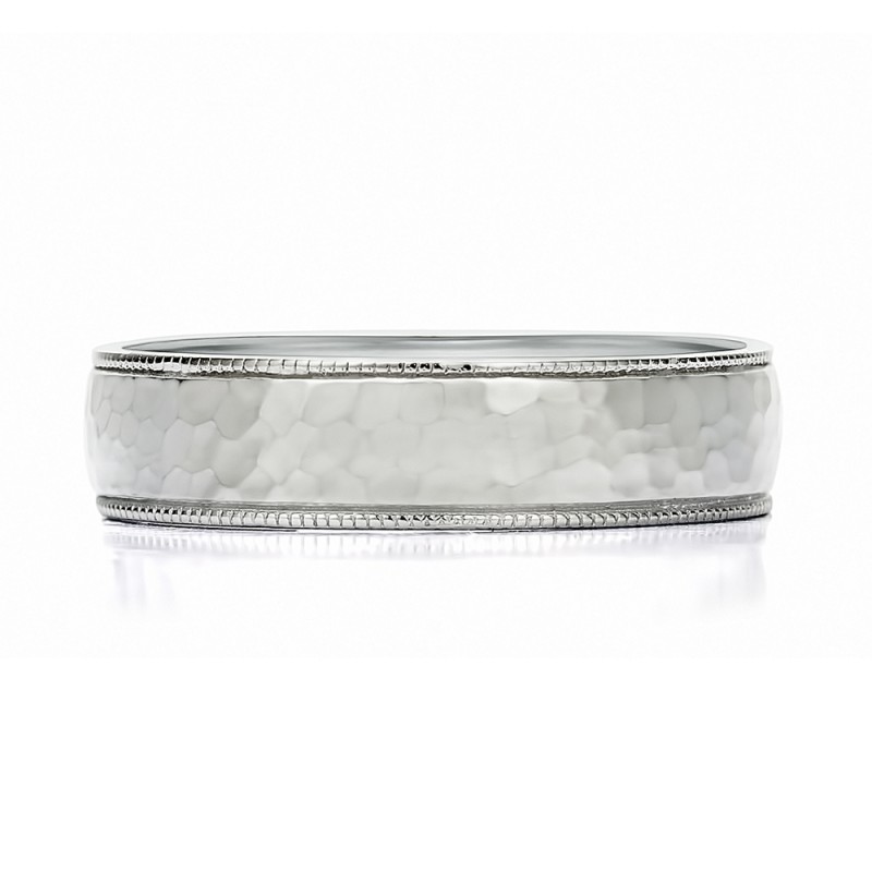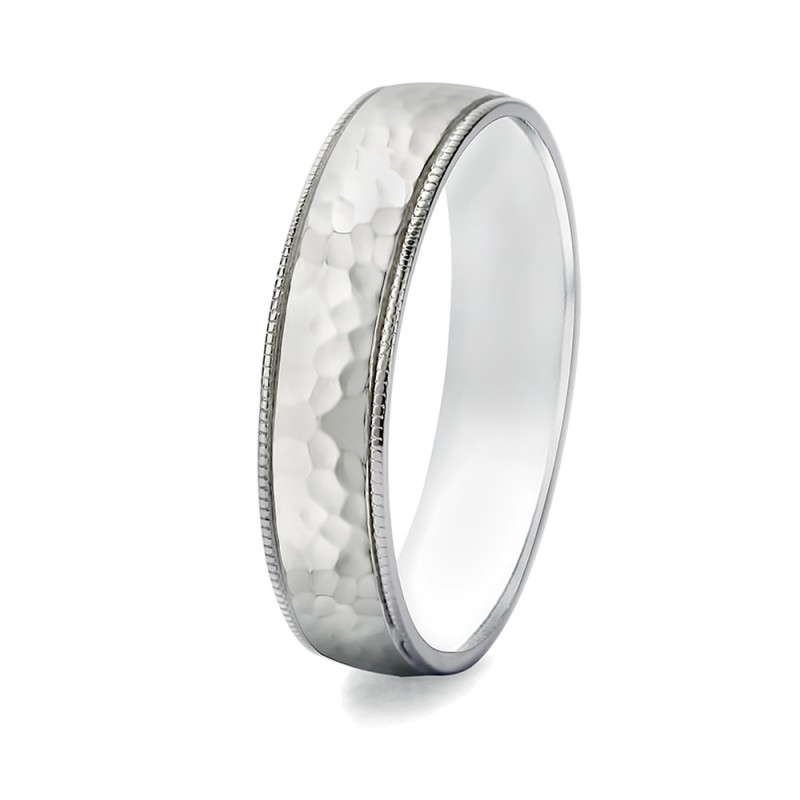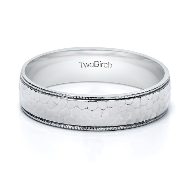 This men's ring features a hammered finish with a 5 millimeter width, with two rows of milgraining detail. This ring is solid, not hollow, making it sturdy and perfect to last a lifetime of daily wear.