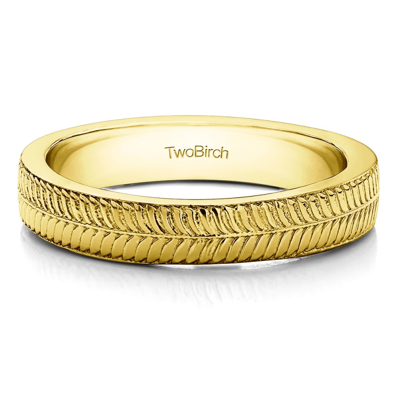 This men's ring features a unique leaf engraved design which goes all the way around the band. The band measures approximately 4.36 mm in width. This ring is solid, not hollow, making it sturdy and perfect to last a lifetime of daily wear.