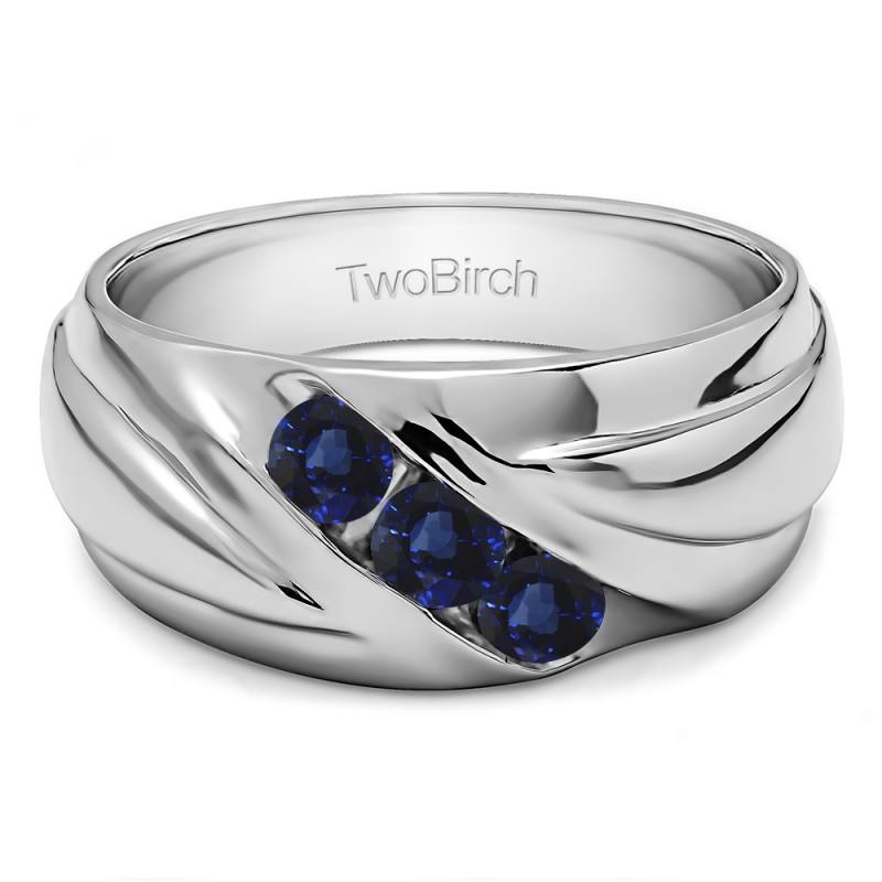 This men's ring features 3, blue round channel set stones. The band measures 5.5mm in total width. The total combined carat weight is 0.15 carats. This listing features natural blue sapphires. This men's ring weighs 10.53 grams and features a comfort fit band. This men's ring has an open ended channel with a twisted shank design.