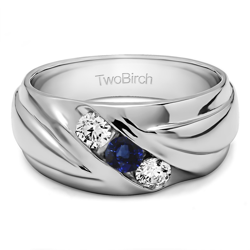 This men's ring features 3, blue and white round channel set stones. The band measures 5.5mm in total width. The total combined carat weight is 0.15 carats. This listing features natural blue sapphires and natural diamonds. This men's ring weighs 10.53 grams and features a comfort fit band. This men's ring has an open ended channel with a twisted shank design.