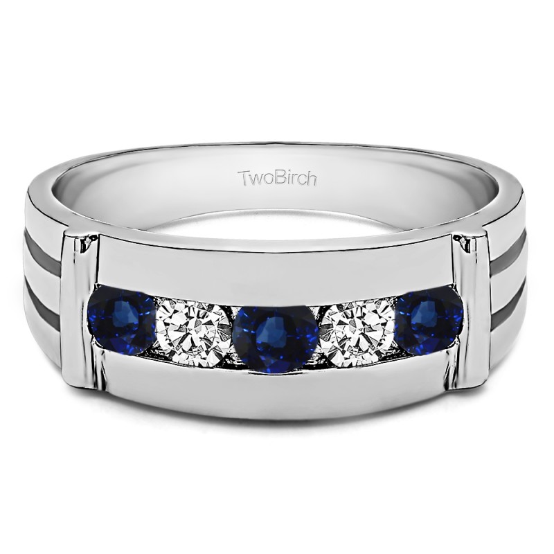 This men's ring features 5, blue and white round channel set stones. The band measures 5.5mm in total width. The total combined carat weight is 0.17 carats. This listing features natural blue sapphires and natural diamonds. This men's ring weighs 10.36 grams and features a comfort fit band. This men's band has a ribbed shank and a raised detailing on each side of the cannel.
