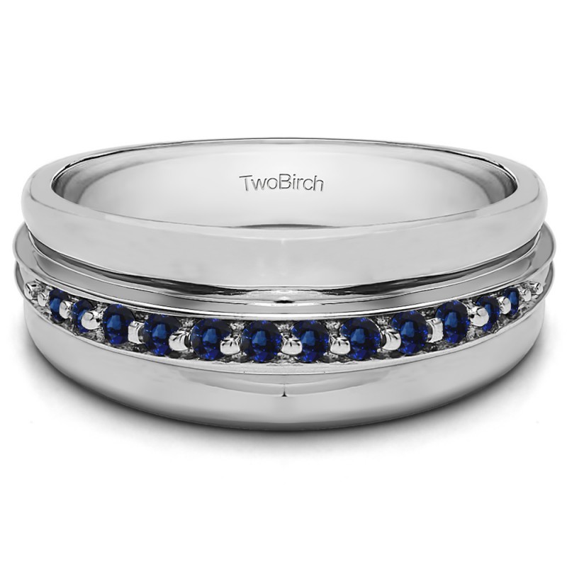 This men's ring features 12, blue round prong in channel set stones. The band measures 5.5mm in total width. The total combined carat weight is 0.2 carats. This listing features natural blue sapphires. This men's ring weighs 10.82 grams and features a comfort fit band. This ring features a raised channel, with the stones set with a shared prong in the channel.