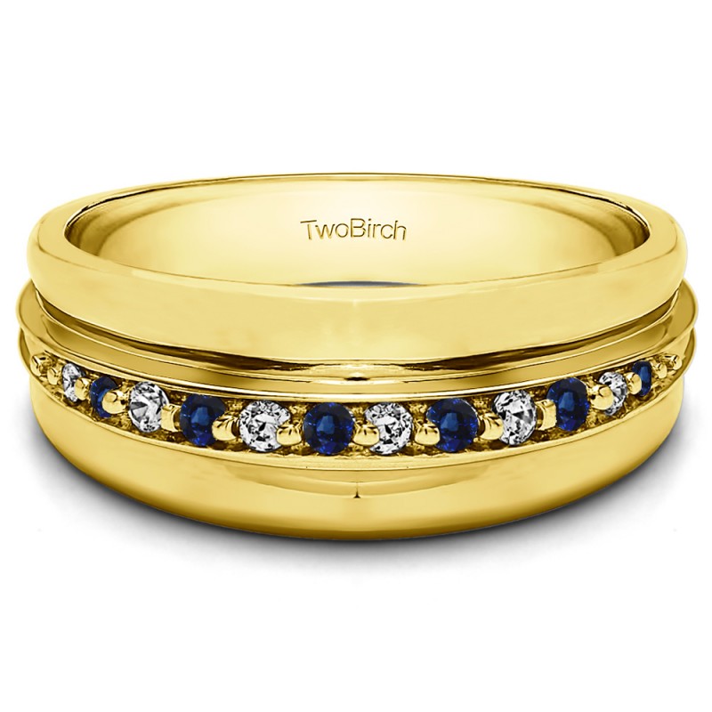 This men's ring features 12, blue and white round prong in channel set stones. The band measures 5.5mm in total width. The total combined carat weight is 0.2 carats. This listing features natural blue sapphires and natural diamonds. This men's ring weighs 10.82 grams and features a comfort fit band. This ring features a raised channel, with the stones set with a shared prong in the channel.