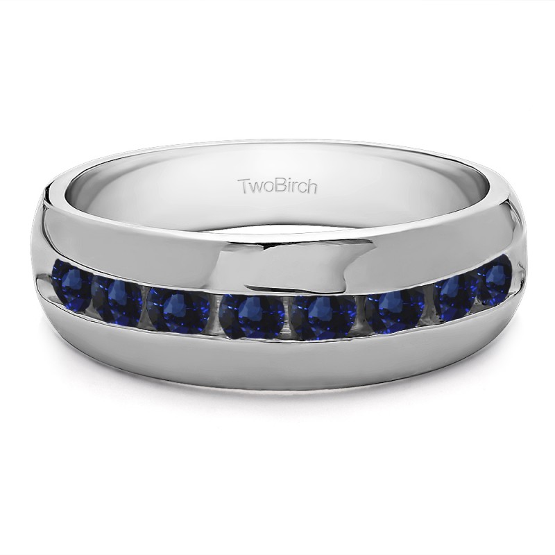This men's ring features 8, blue round channel set stones. The band measures 5.5mm in total width. The total combined carat weight is 0.23 carats. This listing features natural blue sapphires. This men's ring weighs 9.8 grams and features a comfort fit band. This men's wedding band features a stunning high polish finish, with open ended channels.