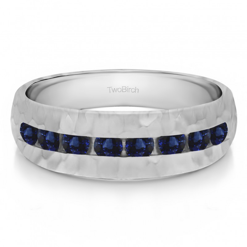 This men's ring features 8, blue round channel set stones. The band measures 5.5mm in total width. The total combined carat weight is 0.23 carats. This listing features natural blue sapphires. This men's ring weighs 9.3 grams and features a comfort fit band. This men's wedding band features a stunning hammered finish, with open ended channels.