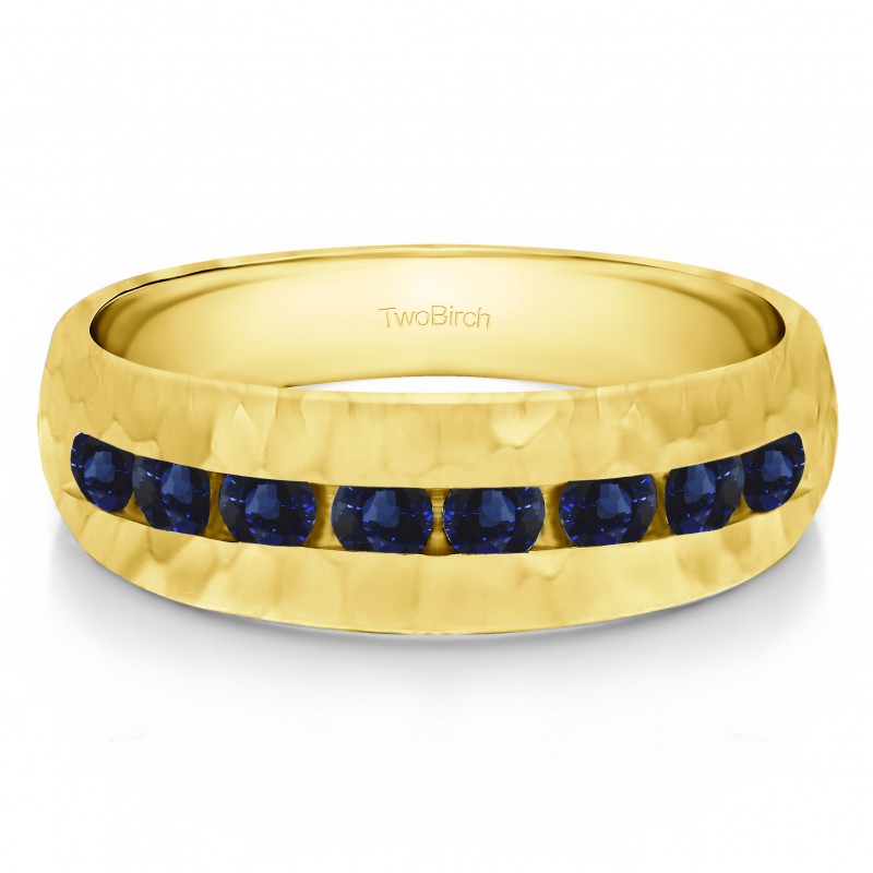This men's ring features 8, blue round channel set stones. The band measures 5.5mm in total width. The total combined carat weight is 0.23 carats. This listing features natural blue sapphires. This men's ring weighs 9.3 grams and features a comfort fit band. This men's wedding band features a stunning hammered finish, with open ended channels.