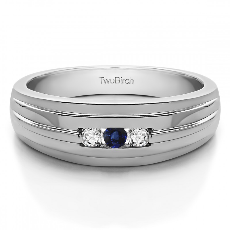 This men's ring features 3, blue and white round channel set stones. The band measures 7.5 in total width. The total combined carat weight is 0.24 carats. This listing features natural blue sapphires and natural diamonds. This men's ring weighs 10.85 grams and features a comfort fit band. This men's ring features a ribbed shank. It also has a cut out gallery making it lighter but still sturdy.