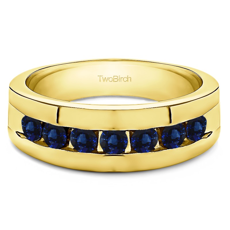 This men's ring features 7, blue round channel set stones. The band measures 5.5mm in total width. The total combined carat weight is 0.25 carats. This listing features natural blue sapphires. This men's ring weighs 5.4 grams and features a comfort fit band. This men's ring is wide with an open channel and high polish finish.