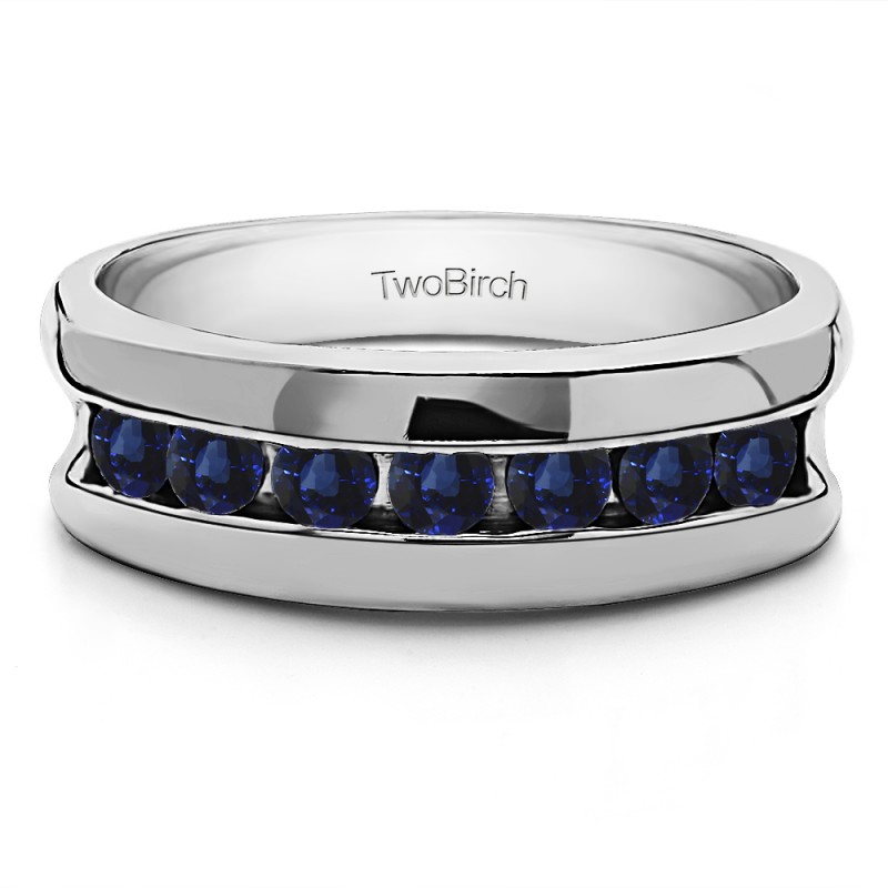 This men's ring features 7, blue round channel set stones. The band measures 5.5mm in total width. The total combined carat weight is 0.25 carats. This listing features natural blue sapphires. This men's ring weighs 10.14 grams and features a comfort fit band. This men's ring features a stunning, high polish finish.