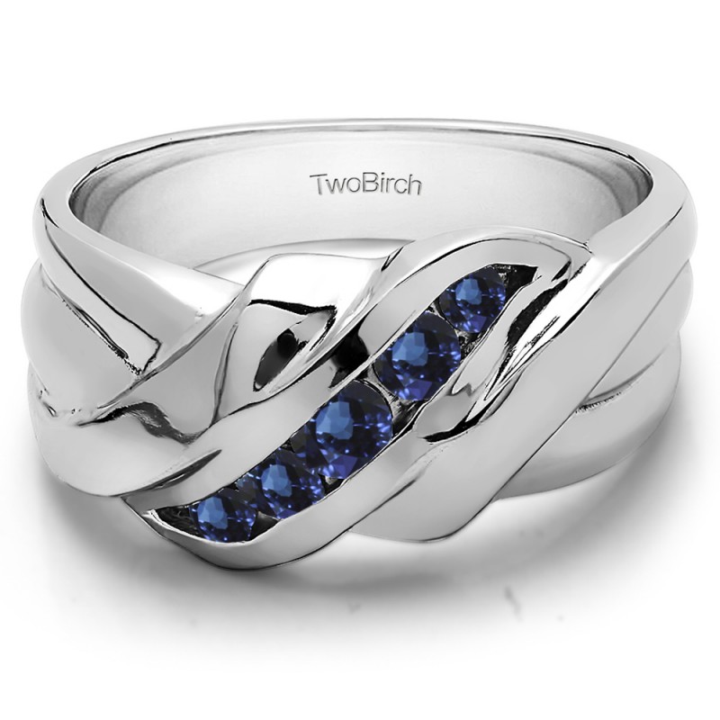 This men's ring features 5, blue round channel set stones. The band measures 5.5mm in total width. The total combined carat weight is 0.25 carats. This listing features natural blue sapphires. This men's ring weighs 14.87 grams and features a comfort fit band. This men's ring features a graduated channel, with a twisted designed shank.