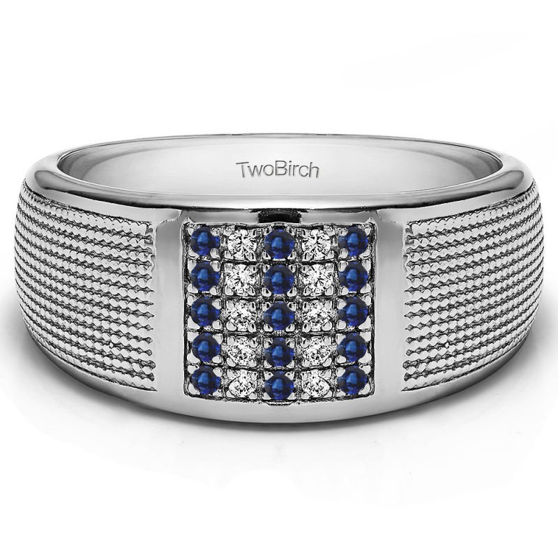 This men's ring features 25, blue and white round pave set stones. The band measures 5.5mm in total width. The total combined carat weight is 0.25 carats. This listing features natural blue sapphires and natural diamonds. This men's ring weighs 19.05 grams and features a comfort fit band. This men's ring is wide with a designer shank and square center cluster of stones.