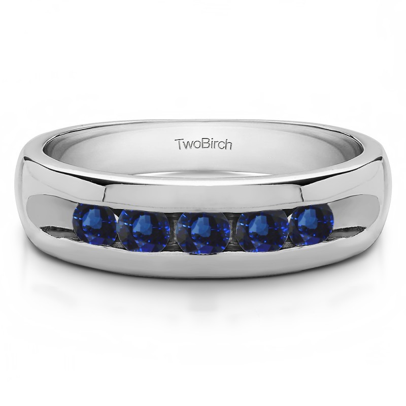 This men's ring features 5, blue round channel set stones. The band measures 5.5mm in total width. The total combined carat weight is 0.25 carats. This listing features natural blue sapphires. This men's ring weighs 8.16 grams and features a comfort fit band. This men's band features a wide channel, with open ends, and gorgeous high polish finish.