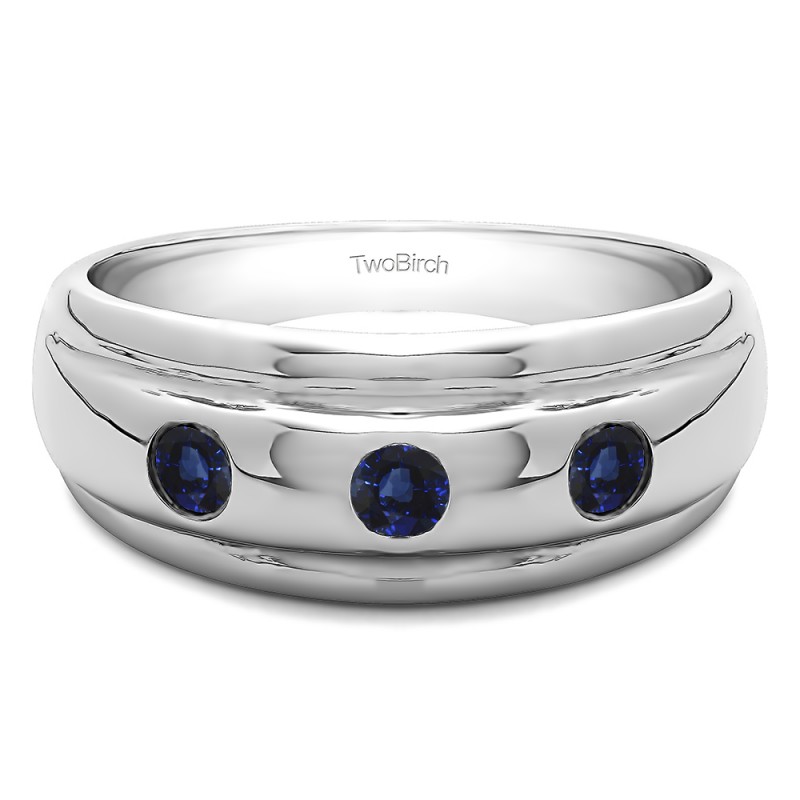 This men's ring features 3, blue round channel set stones. The band measures 5.5mm in total width. The total combined carat weight is 0.3 carats. This listing features natural blue sapphires. This men's ring weighs 14.61 grams and features a comfort fit band. This men's ring is wide with a raised center and a high polish finish.