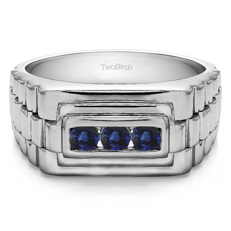 This men's ring features 3, blue round channel set stones. The band measures 5.5mm in total width. The total combined carat weight is 0.3 carats. This listing features natural blue sapphires. This men's ring weighs 10.03 grams and features a comfort fit band. This men's ring features a jubilee style shank.