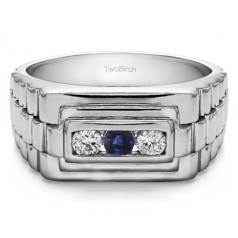 This men's ring features 3, blue and white round channel set stones. The band measures 5.5mm in total width. The total combined carat weight is 0.3 carats. This listing features natural blue sapphires and natural diamonds. This men's ring weighs 10.03 grams and features a comfort fit band. This men's ring features a jubilee style shank.