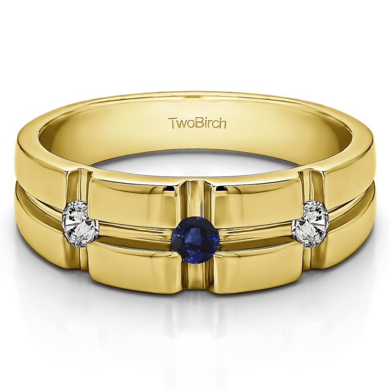 This men's ring features 3, blue and white round channel set stones. The band measures 5.5mm in total width. The total combined carat weight is 0.3 carats. This listing features natural blue sapphires and natural diamonds. This men's ring weighs 12.4 grams and features a comfort fit band. This wide men's ring has three indented vertical rows and one horizontal intended row. The design is reminiscent of crosses.