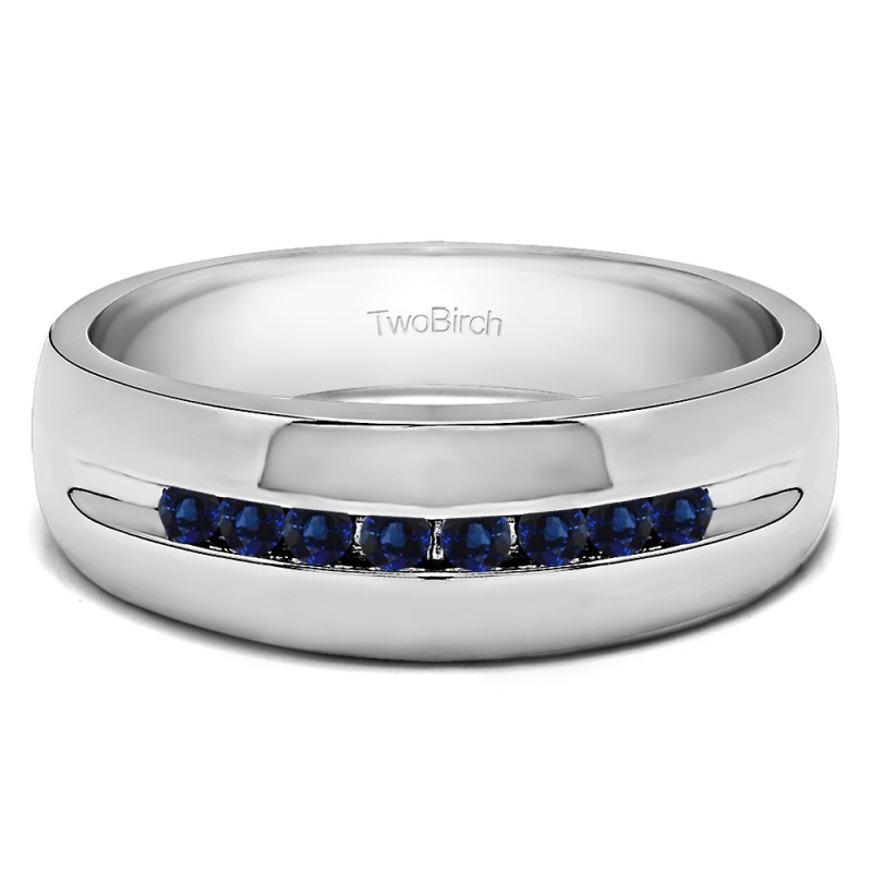 This men's ring features 8, blue round channel set stones. The band measures 5.5mm in total width. The total combined carat weight is 0.32 carats. This listing features natural blue sapphires. This men's ring weighs 12.73 grams and features a comfort fit band. This ring features a thing channel, with open ends, and a stunning high polish finish.