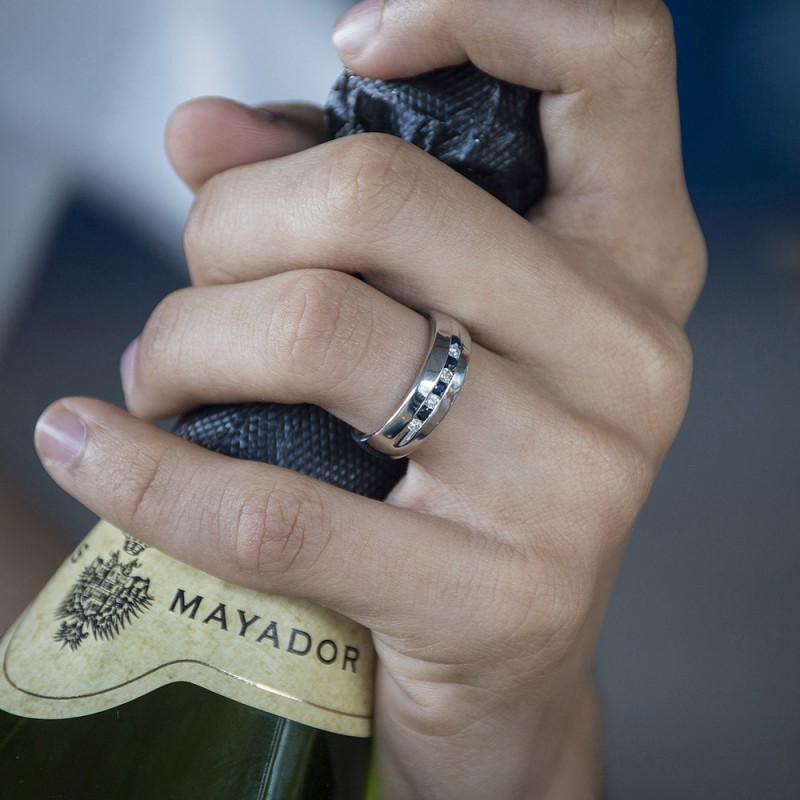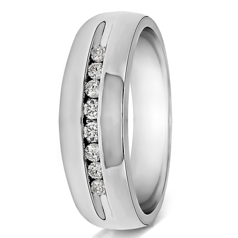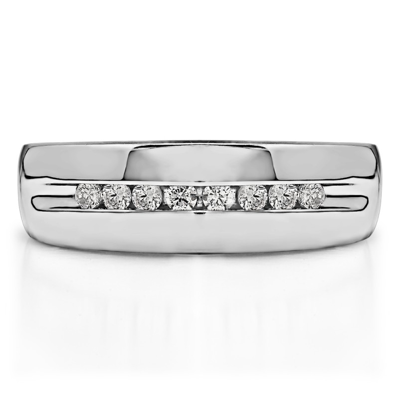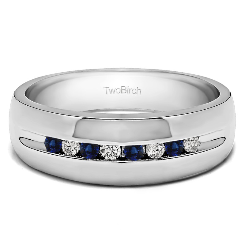 This men's ring features 8, blue and white round channel set stones. The band measures 5.5mm in total width. The total combined carat weight is 0.32 carats. This listing features natural blue sapphires and natural diamonds. This men's ring weighs 12.73 grams and features a comfort fit band. This ring features a thing channel, with open ends, and a stunning high polish finish.