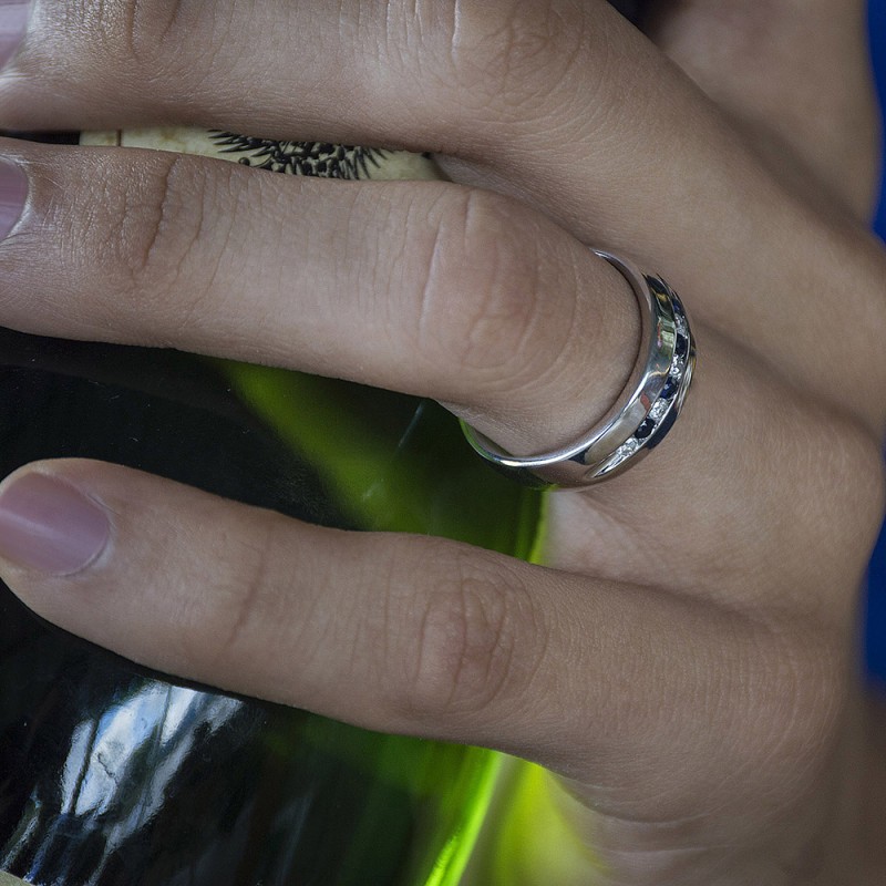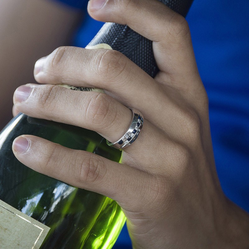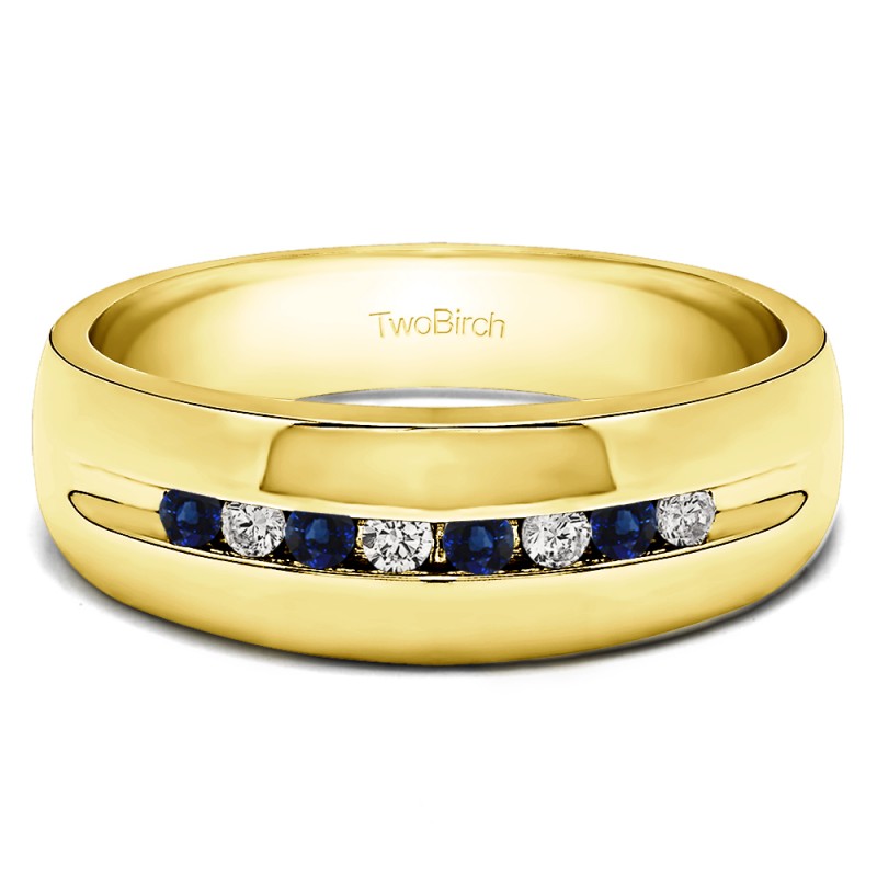 This men's ring features 8, blue and white round channel set stones. The band measures 5.5mm in total width. The total combined carat weight is 0.32 carats. This listing features natural blue sapphires and natural diamonds. This men's ring weighs 12.73 grams and features a comfort fit band. This ring features a thing channel, with open ends, and a stunning high polish finish.