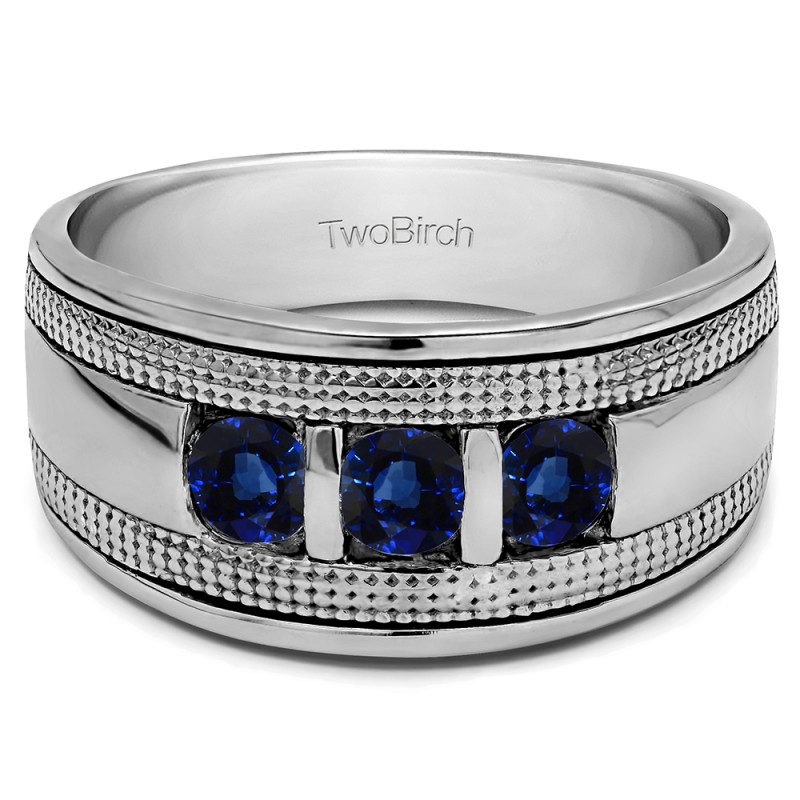 This men's ring features 3, blue round bar set stones. The band measures 5.5mm in total width. The total combined carat weight is 0.33 carats. This listing features natural blue sapphires. This men's ring weighs 14.85 grams and features a comfort fit band. This ring has a high polish center, with a ribbed design on each side of the shank.