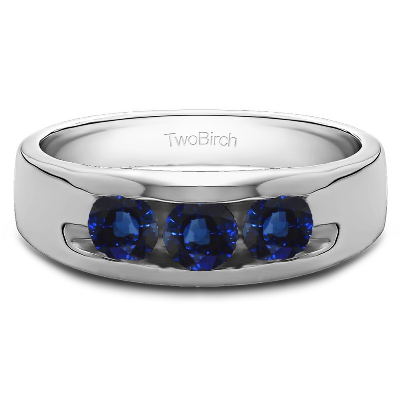 This men's ring features 3, blue round channel set stones. The band measures 4.21mm in total width. The total combined carat weight is 0.33 carats. This listing features natural blue sapphires. This men's ring weighs 5.9 grams and features a comfort fit band. This men's band is wide and has open ended channels.