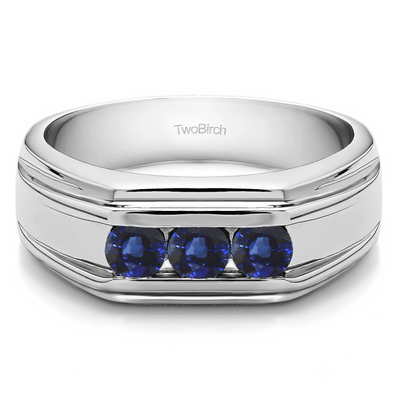 This men's ring features 3, blue round channel set stones. The band measures 5.5mm in total width. The total combined carat weight is 0.33 carats. This listing features natural blue sapphires. This men's ring weighs 14.61 grams and features a comfort fit band. This men's ring features an open ended channel, with raised edges and a high polish finish.