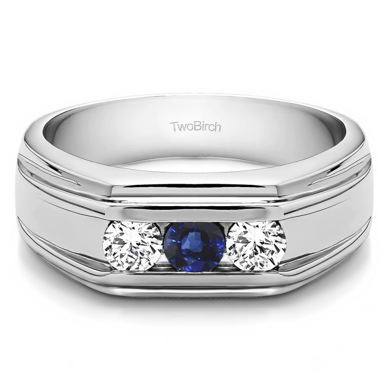 This men's ring features 3, blue and white round channel set stones. The band measures 5.5mm in total width. The total combined carat weight is 0.33 carats. This listing features natural blue sapphires and natural diamonds. This men's ring weighs 14.61 grams and features a comfort fit band. This men's ring features an open ended channel, with raised edges and a high polish finish.