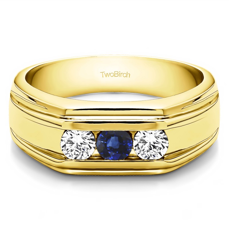 This men's ring features 3, blue and white round channel set stones. The band measures 5.5mm in total width. The total combined carat weight is 0.33 carats. This listing features natural blue sapphires and natural diamonds. This men's ring weighs 14.61 grams and features a comfort fit band. This men's ring features an open ended channel, with raised edges and a high polish finish.