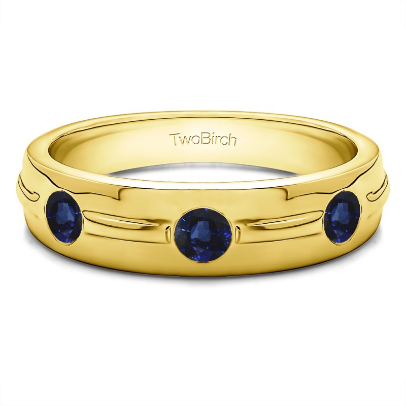 This men's ring features 3, blue round burnished set stones. The band measures 5.5mm in total width. The total combined carat weight is 0.35 carats. This listing features natural blue sapphires. This men's ring weighs 11.26 grams and features a comfort fit band. This men's band features a raised center between the stones with a polished finish.