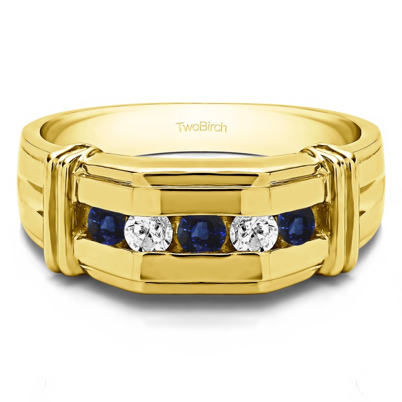 This men's ring features 5, blue and white round channel set stones. The band measures 5.5mm in total width. The total combined carat weight is 0.36 carats. This listing features natural blue sapphires and natural diamonds. This men's ring weighs 12.79 grams and features a comfort fit band. This men's band features a raised design on each of the channel with a flat top center.