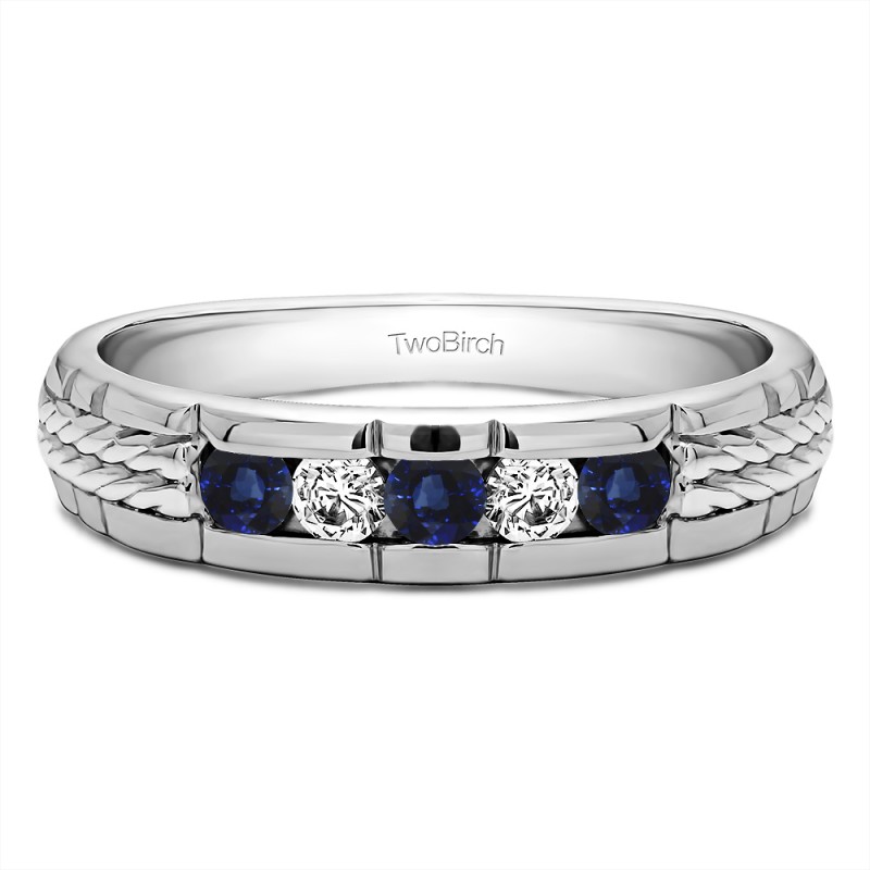 This men's ring features 3, blue and white round channel set stones. The band measures 5.5mm in total width. The total combined carat weight is 0.36 carats. This listing features natural blue sapphires and natural diamonds. This men's ring weighs 14.67 grams and features a comfort fit band. This ring has a braided center with high polished edges.
